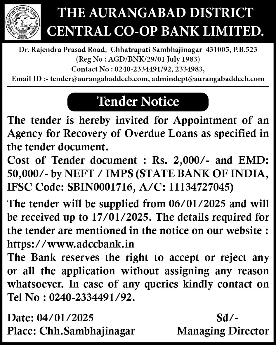 The Aurangabad District Central Co. Op. Bank Ltd invites online tenders in two-bid format
