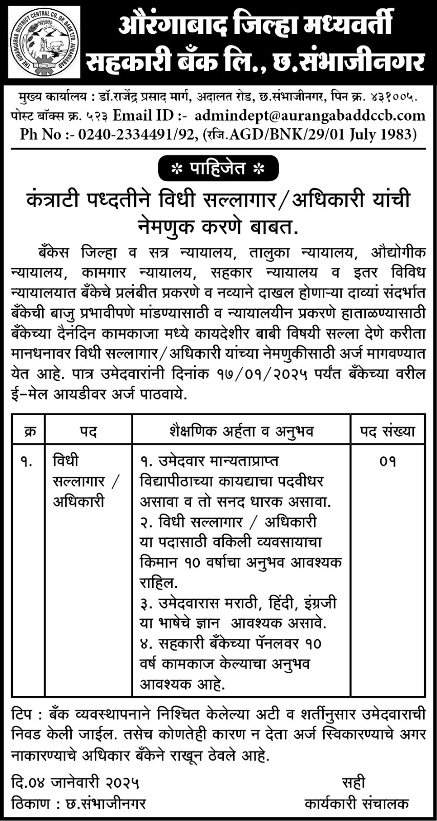 Applications are hereby invited for following positions for monitoring and management of day to day working of IT hardware, CBS Solution, Database, Data Backup, Data Center & Cyber Security for Aurangabad District Central Co-Op Bank Ltd. on contract basis. |